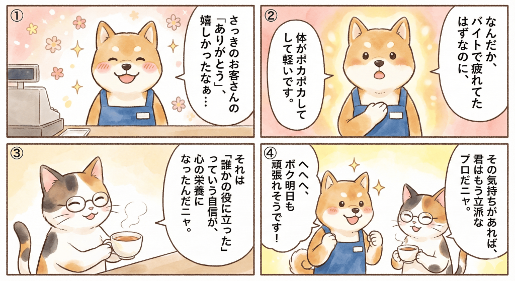 お仕事で疲れていても、たった一言の「ありがとう」で元気が湧いてくること、ありますよね🌸 それは、あなたが誰かの役に立ったという素敵な証拠。 心の栄養をチャージして、今日も無理せずがんばるぞい🐶🍵