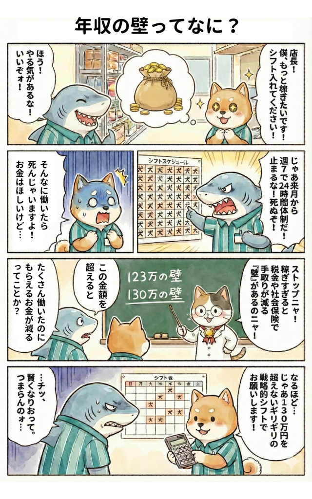 「もっと稼ぎたい!」でもちょっと待って✋ その働き方、「扶養」の範囲を超えてませんか?💸 「123万の壁」「130万の壁」を超えると、税金や保険料で手取りが減っちゃうかも!?😱 賢く働くためのポイントを漫画でチェック!